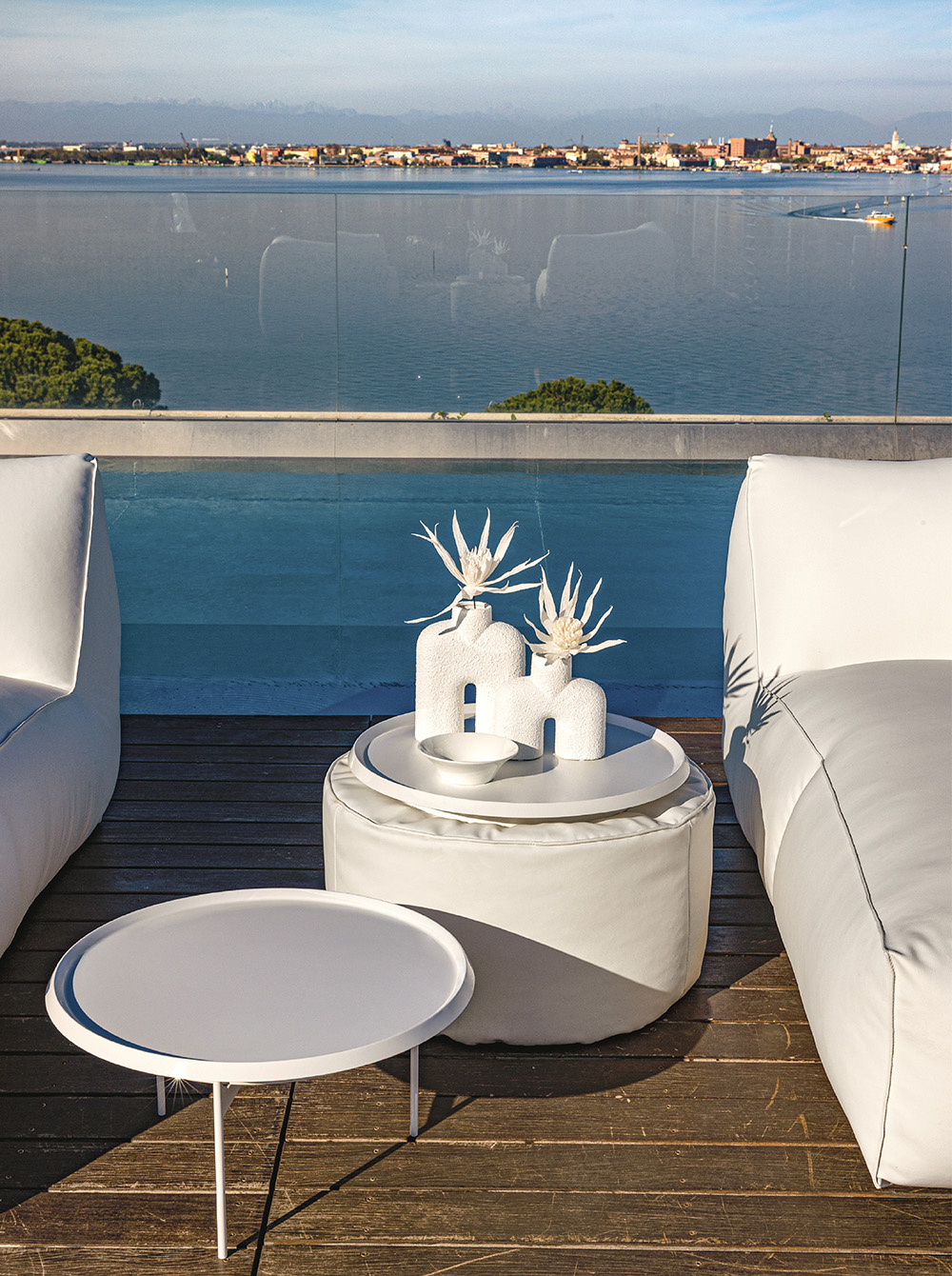 Sky is a collection of high-end outdoor fabrics createci to enhance the style of the most luxurious residential and commercial spaces. Thanks to its soft and enveloping textures, Sky adapts perfectly to the design of outdoor upholstered furniture, from sofas on the terrace to loungers poolside, to deliver maximum comfort in the sunlight. Exceptional resistance to UV rays and minimalist aesthetics, embodied by 5 refined hues, make Sky a collection that lasts over time and the perfect complement to sophisticated outdoor living. Sky is available in the Rooftop version, which reinterprets classic shapes through a balanced and dynamic Greek motif, and in the coordinateci Solarium and Patio weaves, which embrace a simple and unforgettable decorative spirit.